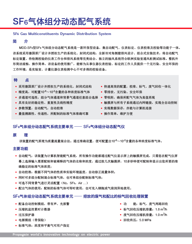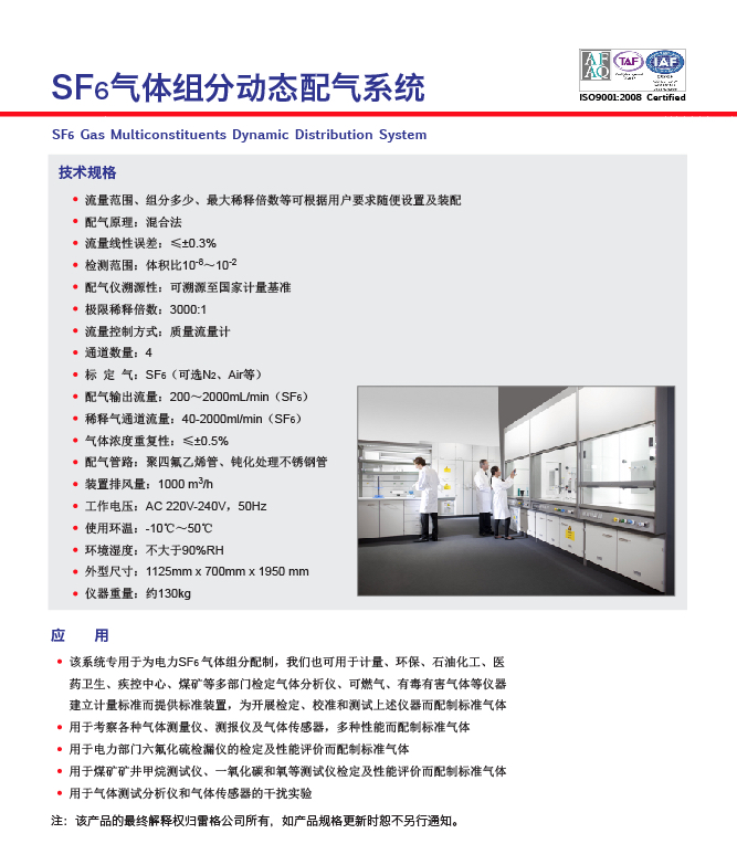 MDD-SF6型SF6 气体组分动态配气系统是一款环保型设备,集自动配气、仪表标定、仪表校准及校验等功能于一体。该系统采用德国原厂设计并授权生产的系统化、封闭式结构,全新双对角侧壁排风设计、组合式安装技术,将自动配气标定装置、待检测校验的仪表工作台和排风系统等完美结合,独立的抽风系统符合欧洲实验室通风柜测试标准。整机外形简洁流畅、操作简单,该设备的使用推广,能够为从事仪器仪表校验、标定的工作人员提供一个无污染、安全环保的工作环境,是实验室、计量仪器仪表检测中心不可多得的校验设备。
