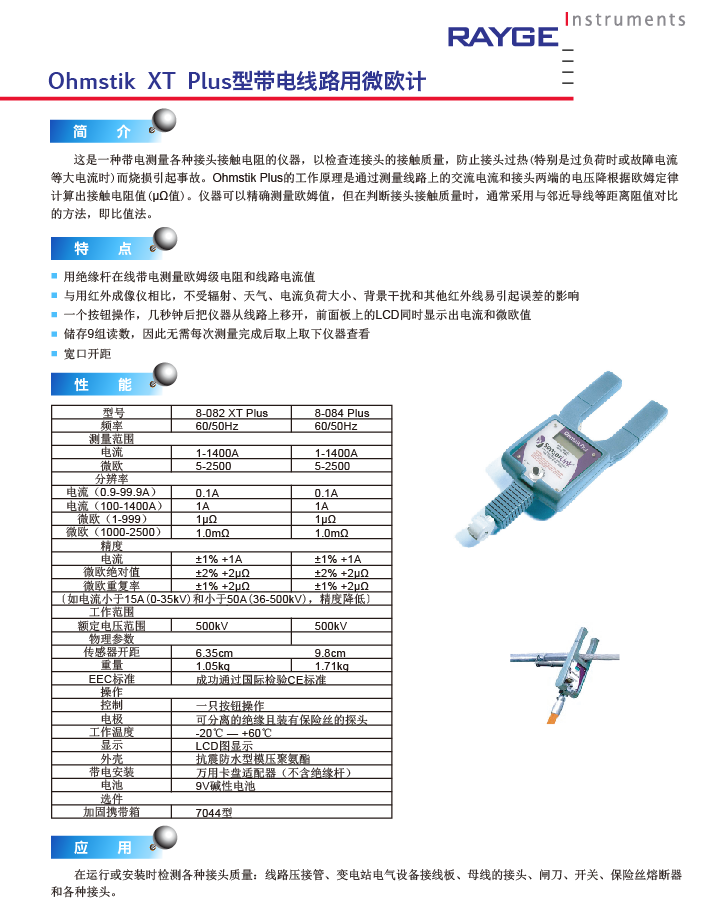 这是一种带电测量各种接头接触电阻的仪器,以检查连接头的接触质量,防止接头过热(特别是过负荷时或故障电流等大电流时)而烧损引起事故。Ohmstik Plus的工作原理是通过测量线路上的交流电流和接头两端的电压降根据欧姆定律计算出接触电阻值(μΩ值)。仪器可以精确测量欧姆值,但在判断接头接触质量时,通常采用与邻近导线等距离阻值对比的方法,即比值法。